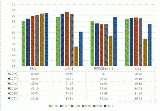 全省毕业生毕业去向落实率为86.98%,其中博士生毕业去向落实率为83.11%,硕士生毕业去向落实率为91.43%,本科生毕业去向落实率为84.32%,专科生毕业去向落实率为89.56%。