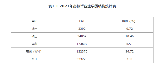 2021年全省普通高校毕业生共有333228名,其中,博士研究生2392人,硕士研究生34859人,本科生173607人,高职(专科)生122370人。(全省各高等院校毕业生人数见附件一)。共涉及282个博士研究生专业,562个硕士研究生专业,319个本科专业,407个高职(专科)专业。