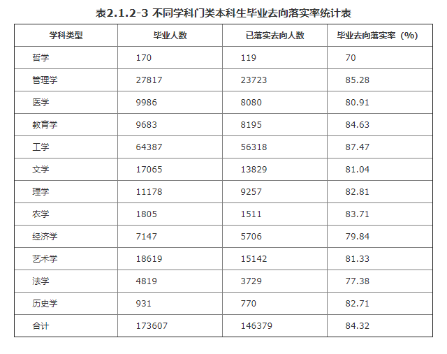 本科生中,毕业去向落实率前三位的学科是工学(87.47%)、管理学(85.28%)、教育学(84.63%),毕业去向落实率后三位的学科是哲学(70%)、法学(77.38%)、经济学(79.84%)。